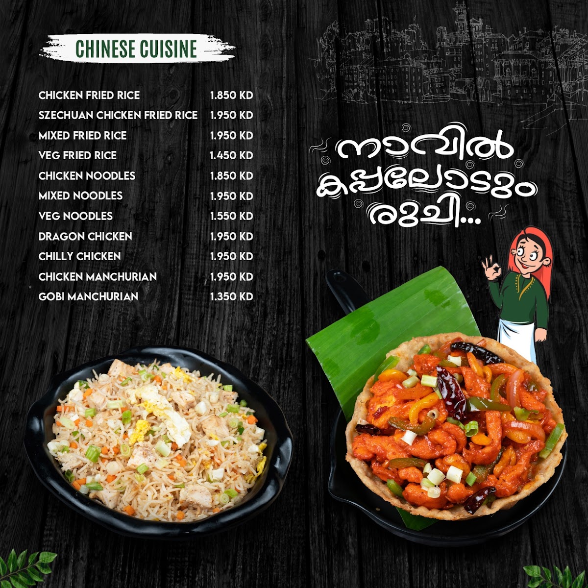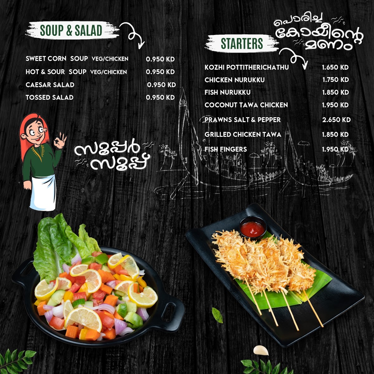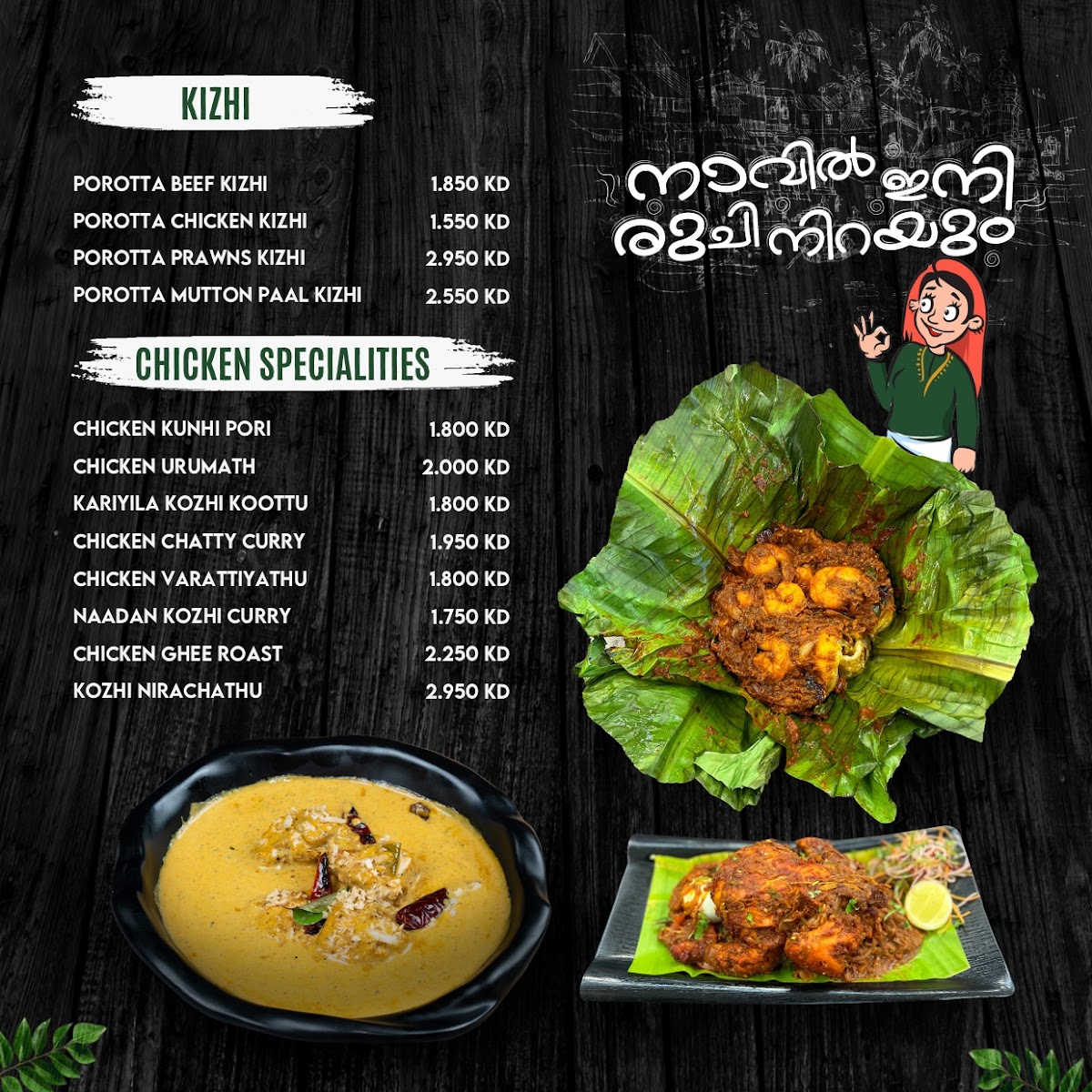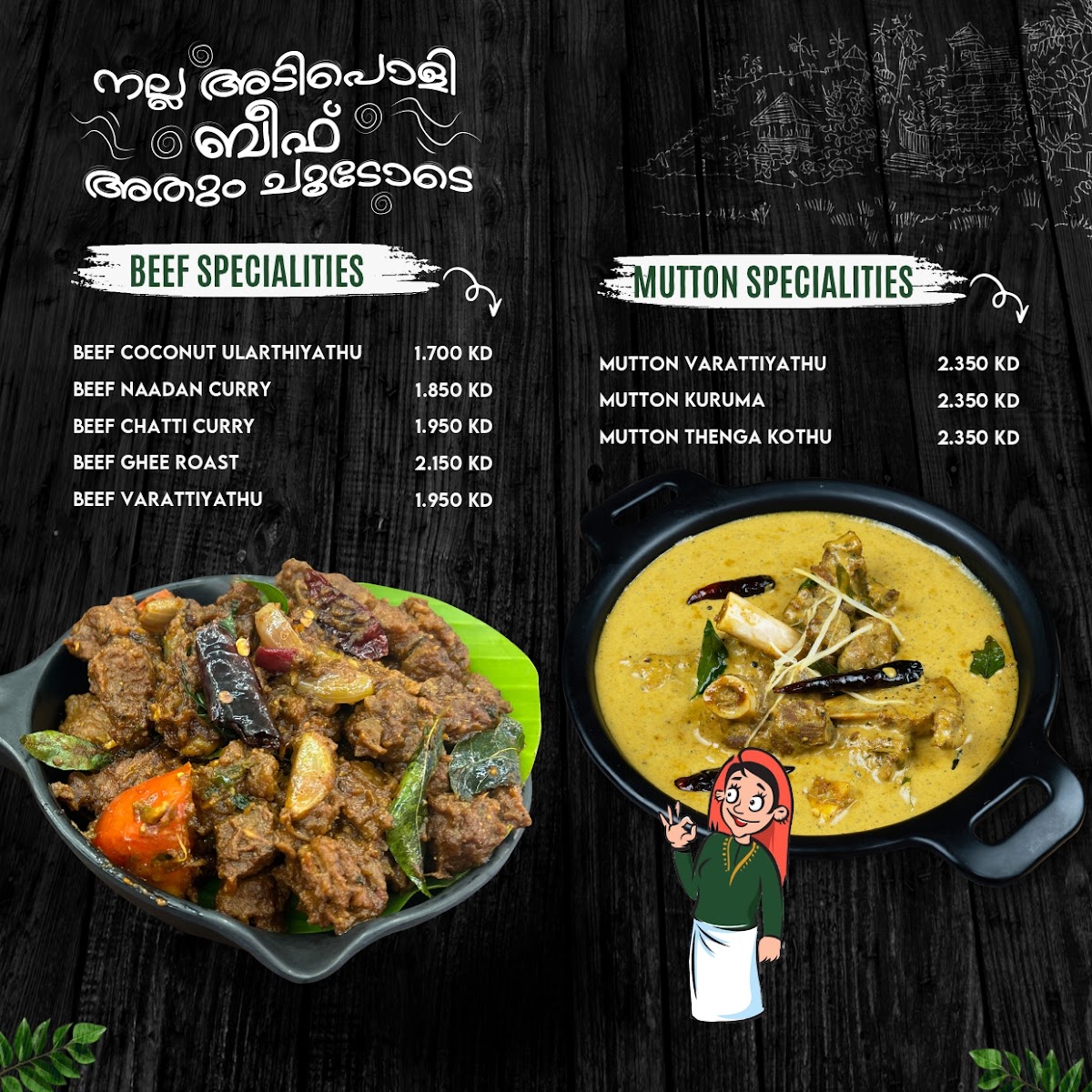 The menu features a selection of Malabar specialties like Kakka Rotti, tender steamed rice balls infused with beef coconut gravy, and Meen Pathiri, delicious fried fish wrapped in a fluffy rice pancake. Each dish is steeped in rich spices that evoke the warmth of home cooking.